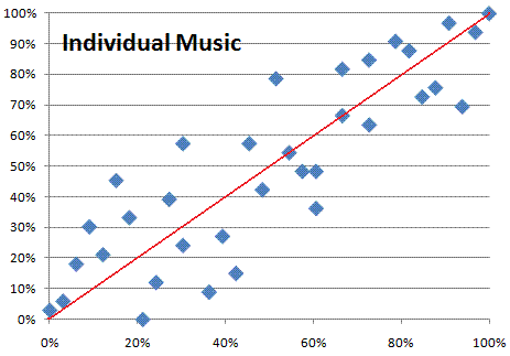 For the graphs below, we have sketched each band’s percentile on the trait specified (individual music and music ensemble here) in semi-finals against their percentile on that trait in the prelims.