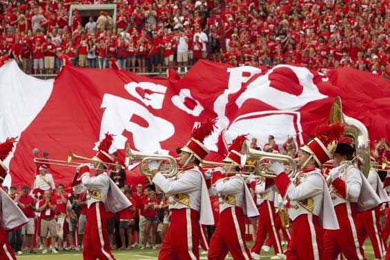 The University of Nebraska, which joined the Big 10 Conference in 2011, brings a marching band to a football game between the Cornhuskers and the University of Wyoming. Led on the field by three Nebraska natives and by drum major Nicholas Raimondi from Deerfield, Ill., the band is known as the Marching Red and was founded in 1879 as an ROTC unit. It stands as one of the oldest marching bands in the nation, winner of the 1927 Distinguished Recognition Trophy, which was presented to the band by John Philip Sousa himself.