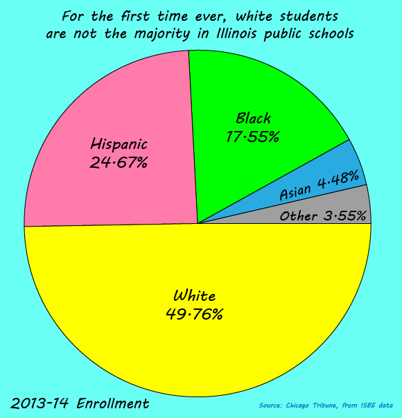 According to a Chicago Tribune analysis of data provided to the Illinois State Board of Education by public school districts, special education cooperatives, and statewide schools, white students now make up less than half of the public school student population in Illinois.