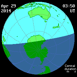 The northern edge of the antumbral shadow first touches down in Antarctica at 01:57:35 AM, EDT (UT-4 hours), NASA’s Goddard Space Flight Center reports. The instant of greatest eclipse, when the distance between the moon’s shadow axis and Earth’s geocentre reaches a minimum, occurs just six minutes later at 02:03:25 AM, EDT. For an observer at the geographic coordinates nearest the shadow axis (131° 15.6′ East longitude, 79° 38.7′ South latitude), the sun would appear on the horizon during the 49-second annular phase. Six minutes later (02:09:36 AM, EDT), the antumbral shadow lifts off the surface of Earth as the annular eclipse ends. The entire zone of annularity appears as a small D-shaped region in eastern Antarctica.