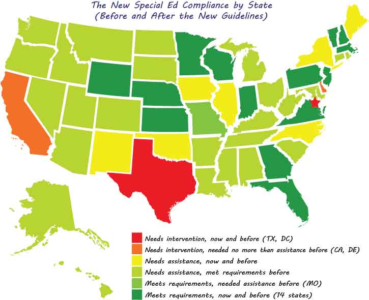 The education department will create a $50 million technical-assistance center for states that need help coming into compliance with the new guidelines. California, Texas, Delaware, and the District of Columbia, which have been identified as needing “intervention,” are first, but several states, including Maryland and Illinois, will fall into the “Needs Assistance” category.