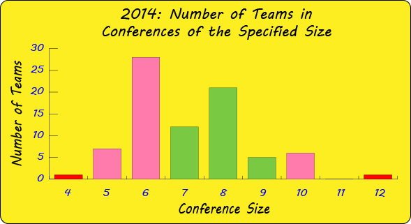If the change is approved, the bars representing conferences of sizes four, five, six, 10, and 12 teams would disappear, and the graph would show probably equal bars for seven, eight, or nine teams.