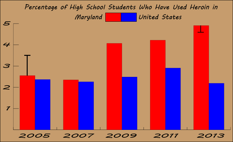 Based on the CDC’s data from the Youth Risk Behavior Survey, the percentage of high school students in the US who have ever used heroin didn’t change significantly from 2005 to 2013. However, the percentage of high school students in Maryland who have ever used the drug nearly doubled over that period, going from 2.55 percent in 2005 to 4.91 percent in 2013, representing a statistically significant increase in heroin use at the 95 percent confidence level.