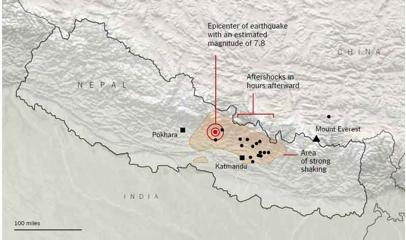 Reports said the 7.8-magnitude quake struck an area of central Nepal between Katmandu and the city of Pokhara early on Saturday, according to the BBC. A map published by the New York Times shows the location more precisely.