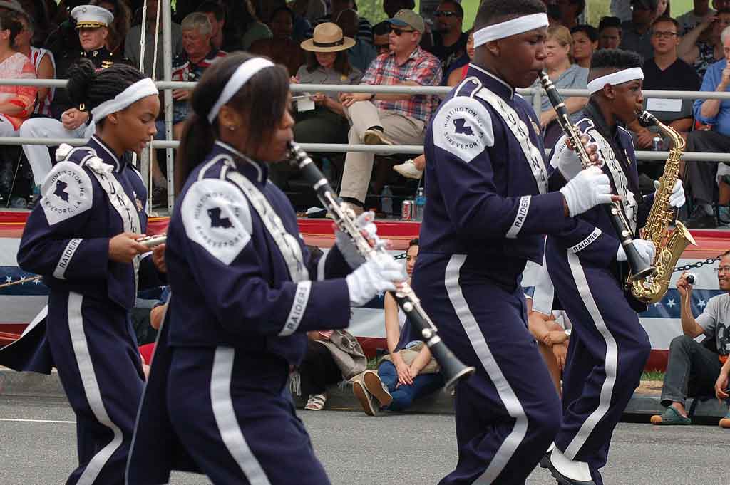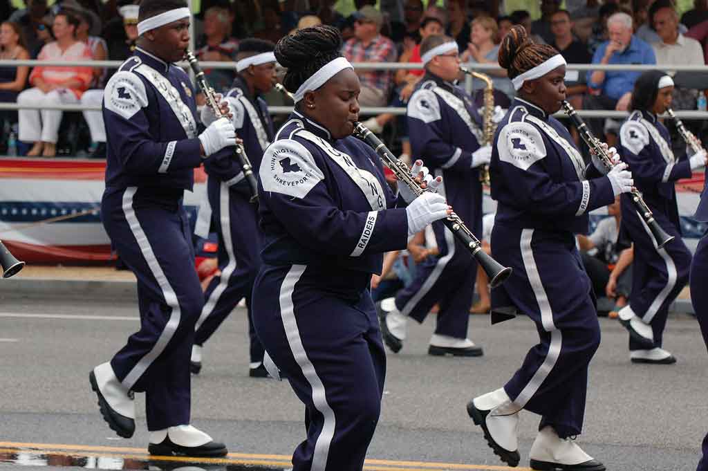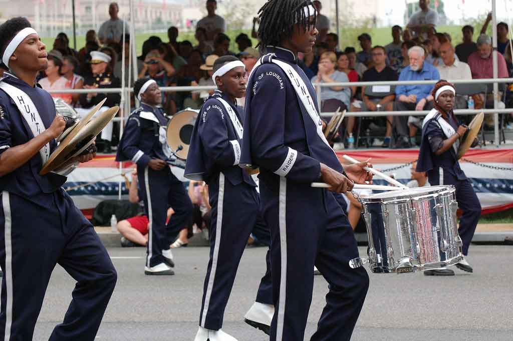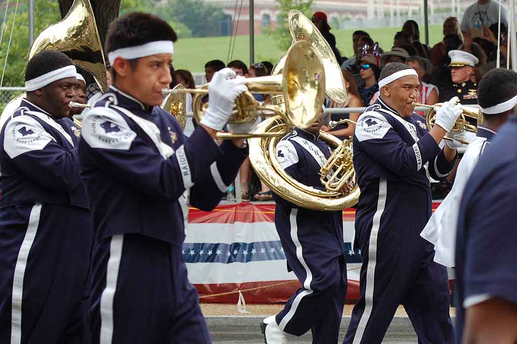 Suggested caption for all photos: WASHINGTON (July 4) — The Raider Jukebox Marching Band from Huntington High School in Shreveport, La., marched in the National Independence Day Parade down Constitution Avenue, in celebration of the nation’s 239th birthday. (Voxitatis)