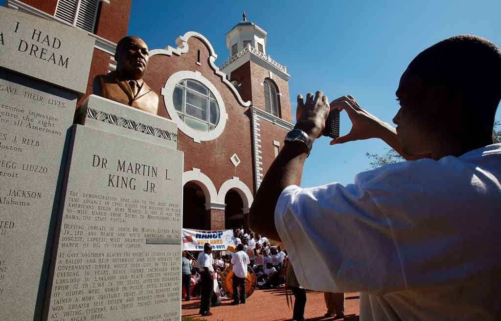 Voters gather near the historic Brown Chapel AME Church in Selma, Alabama, before the 2008 presidential election.