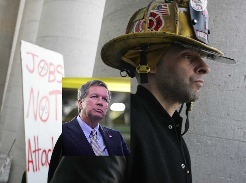 Mr Kasich (inset) delivers the State of the State as workers protest (JD Pooley and Mike Munden/Getty Images)