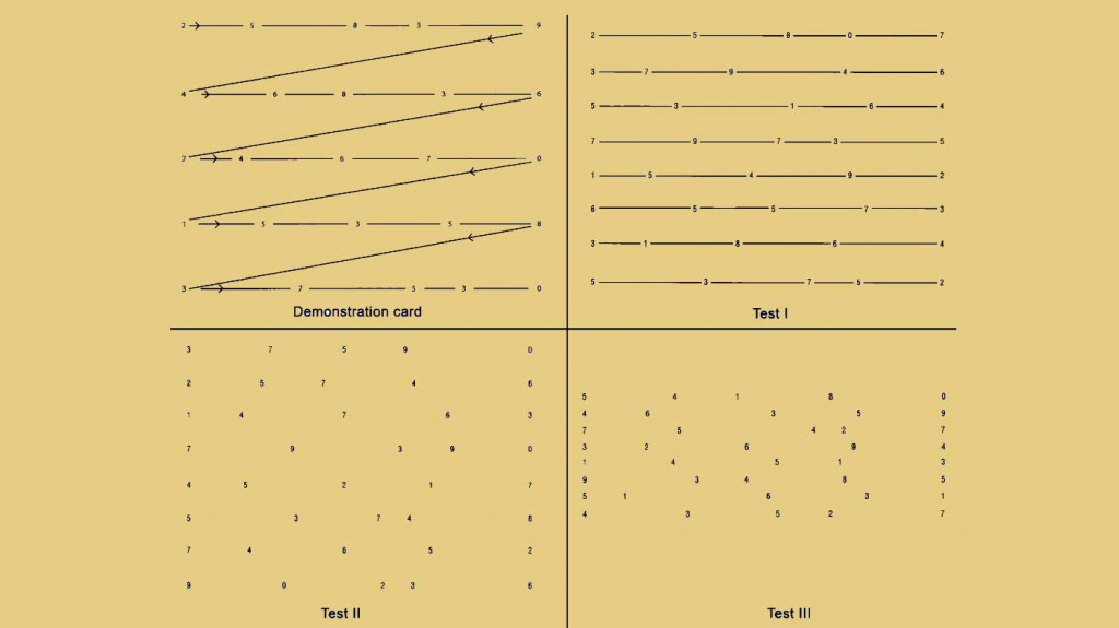 The times for reading the numbers on all three cards are added up, and the total time is the summary score for the athlete on the test.