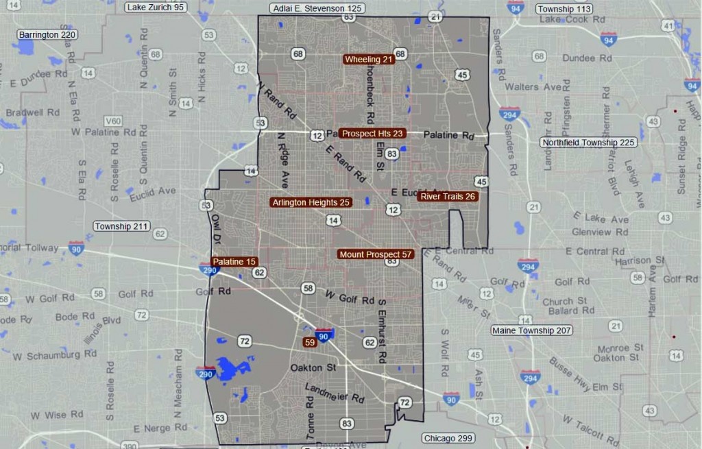 An example of a high school district is Township High School District 214, based in Arlington Heights in Chicago’s northwest suburbs. The district runs six high schools, and each student comes from one of several elementary school districts in the area: