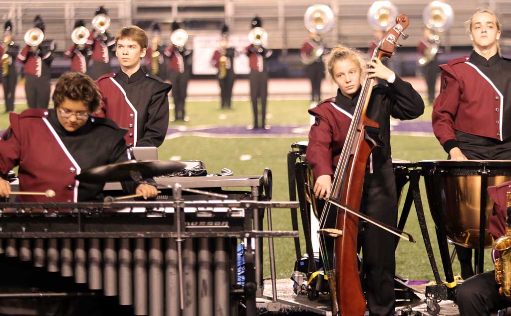 “It’s called marching band for a good reason,” said Collin Hawes, a junior and the section leader for the percussion pit that stands in front of the band for the show.