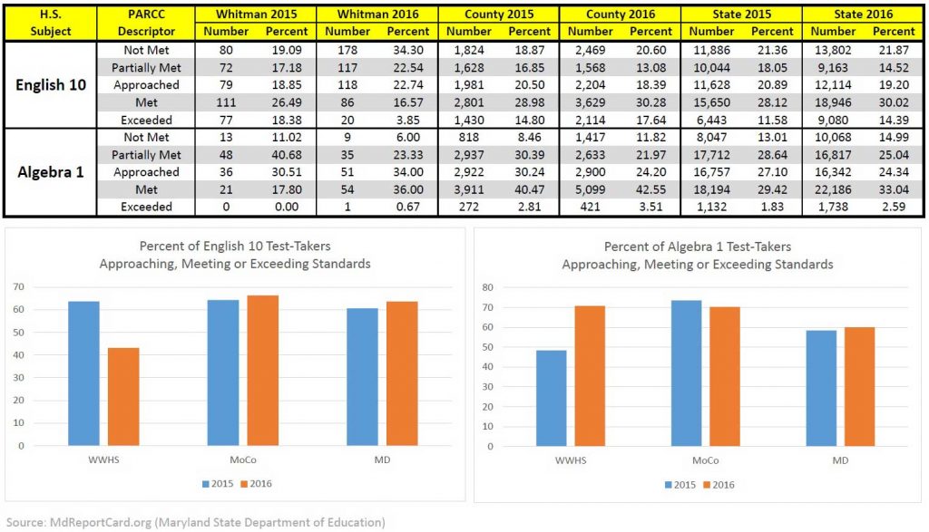 In other Walt Whitman High School-related news, results from the standardized tests known as the Partnership for Assessment of Readiness for College and Careers, or PARCC, released by the Maryland State Department of Education on September 27, show that performance on the English 10 test for students at the high school dropped precipitously, compared to the school’s performance in 2015.