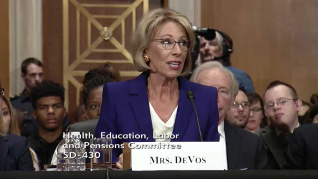 US Education Secretary-designate Betsy DeVos told the Senate Committee on Health, Education, Labor and Pensions at her hearing Tuesday that she couldn’t commit to continuing the Obama administration’s policy of threatening to withhold Title IX funds from schools that don’t investigate campus sexual assault.