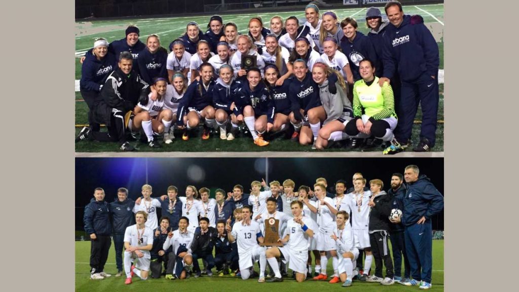 Urbana girls’ (top) and boys’ championship soccer teams (Stacy Ukishima / student newspaper)