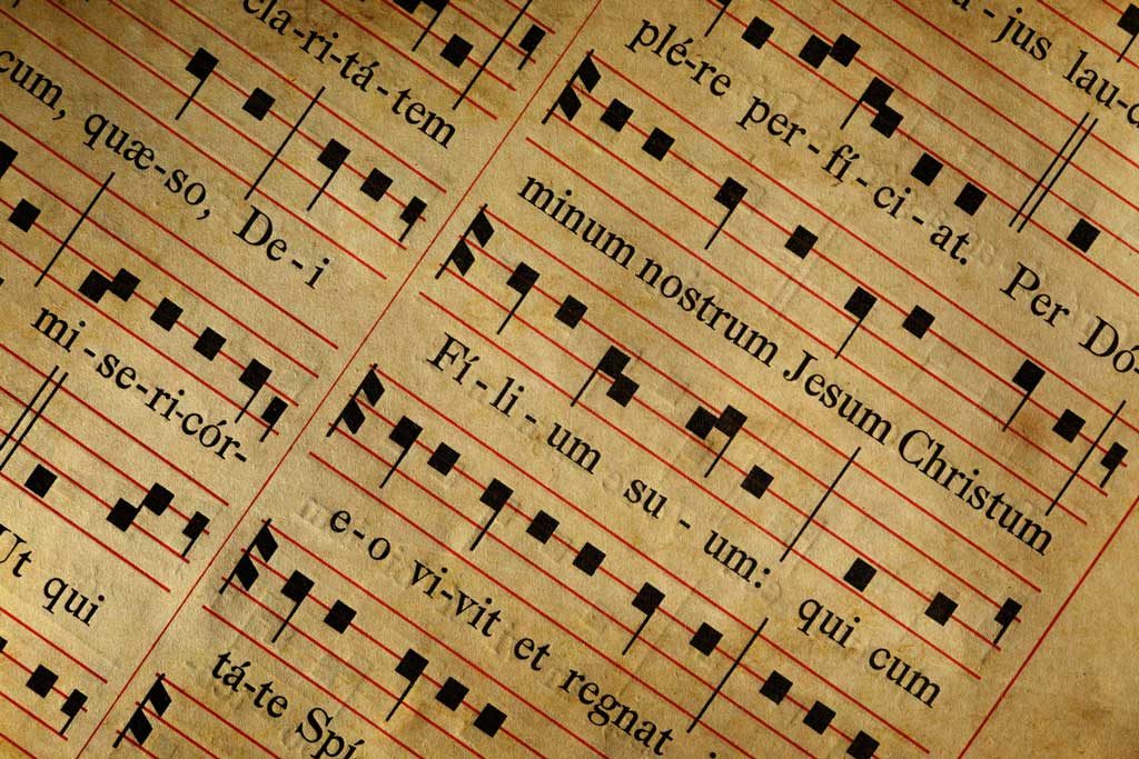 A page from a hymnal, showing Gregorian chant notation (iStock)