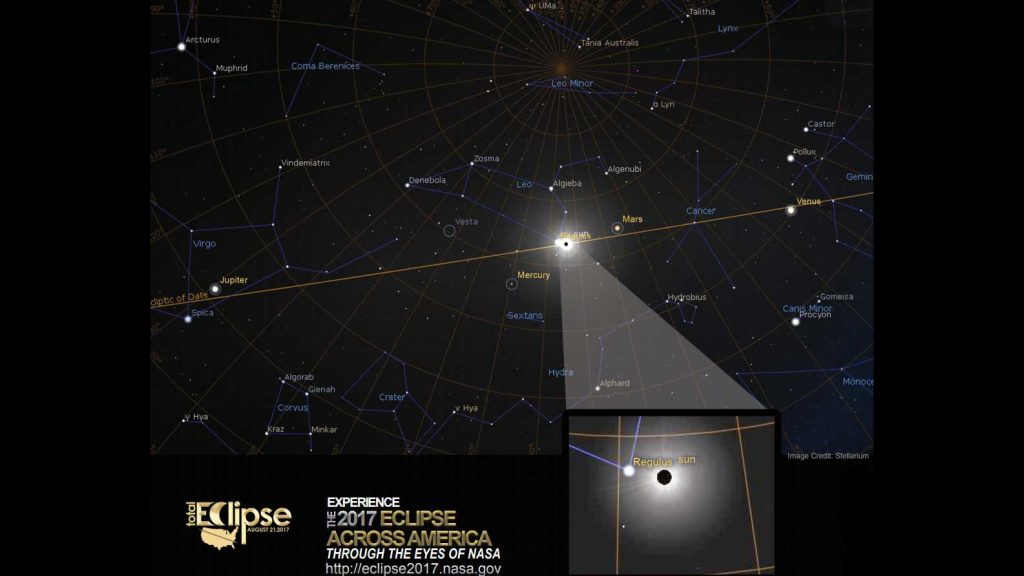 NASA has produced a poster that shows that the sun (and moon) will be in the constellation Leo, very close to its brightest star, Regulus, during the eclipse Monday, and Jupiter, Mars, and Venus will all be in the field, with Mars being very close to the eclipse.