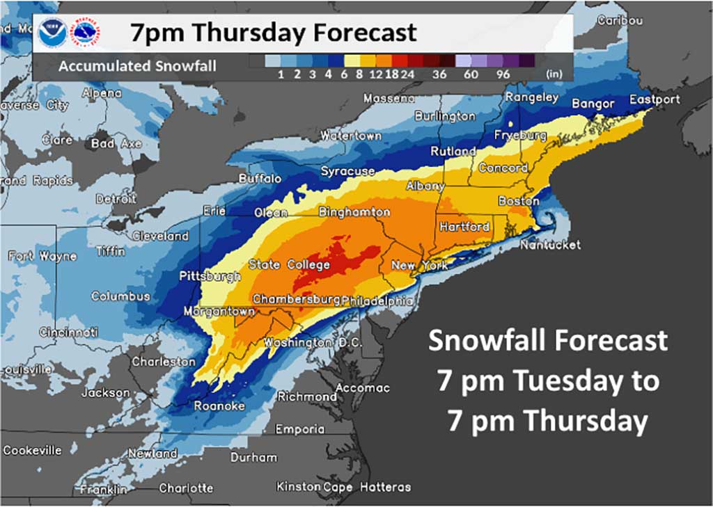 Areas in western Maryland and southern central Pennsylvania were expected to bear the brunt of a nor’easter that arrived Wednesday morning in the nation’s capital and barreled northward along the I-95 corridor. Many areas in Pennsylvania and some in upstate New York expected two feet of snow to fall or more.