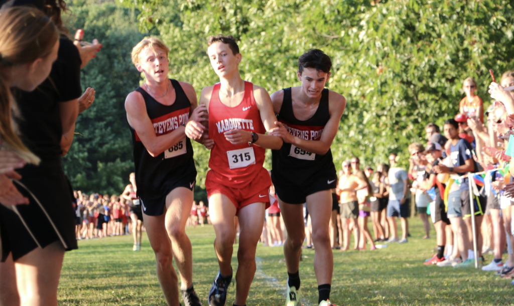 Right after, though, a Marquette runner was heading in for the 2nd spot but lost his footing and stumbled, unable to get back up, exhausted from the efforts. Cooper Erickson was in 3rd and passed him right before the finish line. Noticing the fallen runner, Cooper stopped short of the line and returned to his fallen opponent along with Ethan Olds. They were able to encourage the Marquette player up and across the finish line.