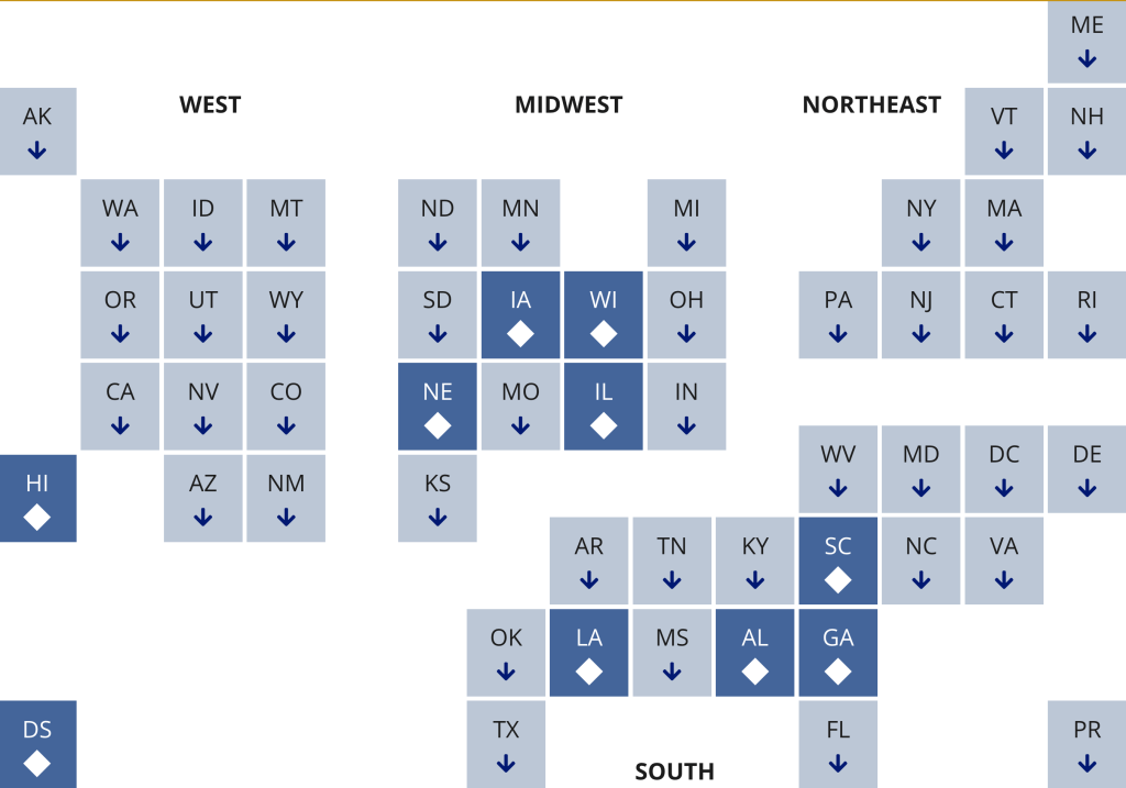 Grade 4 math scores declined in 43 states (down arrow) between 2019 and 2022 (NAEP).