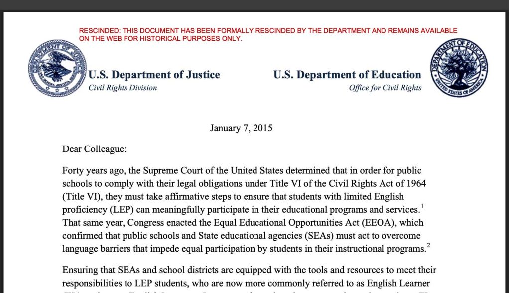 The original document, issued jointly by the Education and Justice Departments in January 2015, reminded states and districts that under Title VI of the Civil Rights Act of 1964 and the Equal Educational Opportunities Act of 1974, they must take affirmative steps to ensure that English learners (EL students) can meaningfully participate in educational programs.