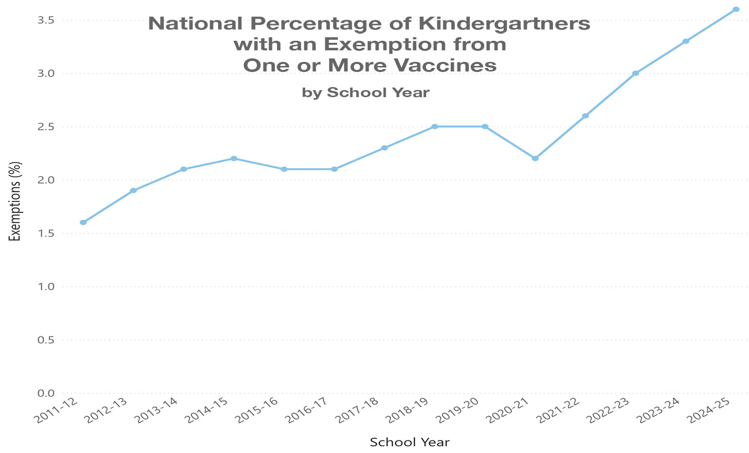 - The number of kindergartners attending school without documentation of completing the MMR vaccine series was about 286,000 during the 2024-25 school year.