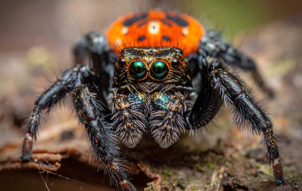 Picture a spider smaller than your pinky nail, standing tall on a leaf and waving its legs like it’s on a disco floor. This is the peacock spider, famous for its bright red, yellow, and blue colors. When a male finds a female, he raises his colorful abdomen, vibrates, and kicks out a hairy leg in an elaborate dance that can last up to an hour. If the female approves, he passes on his genes. If not, he may become her snack.