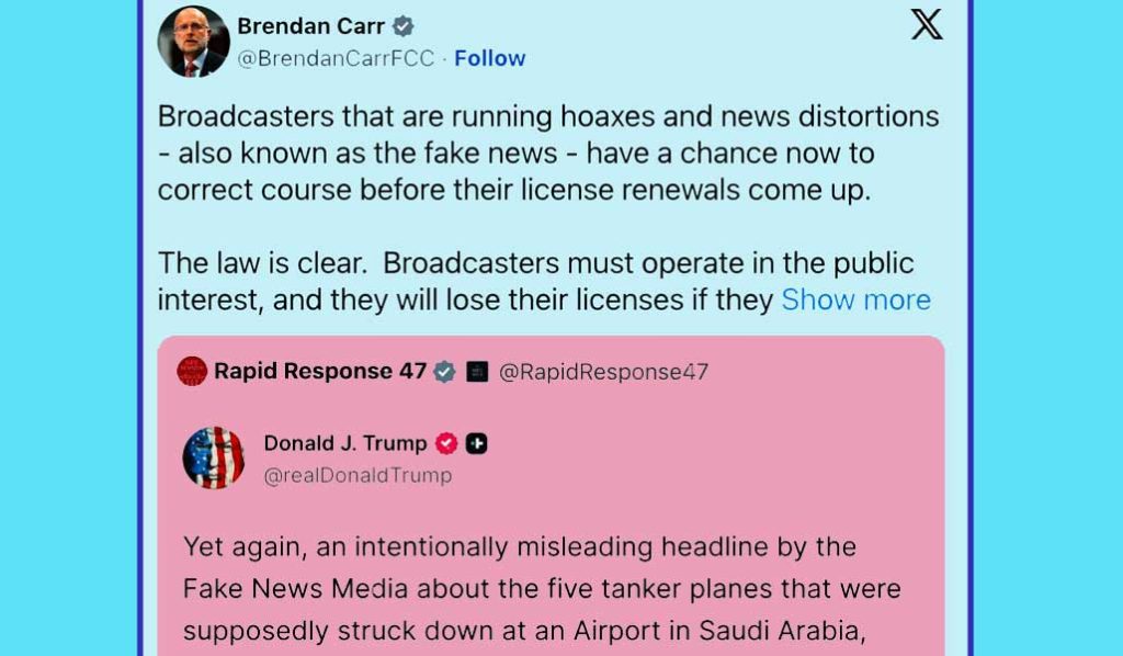 While Carr did not name specific stations, his post echoed the president’s condemnation of outlets like The New York Times and The Wall Street Journal (which do not hold FCC licenses) alongside “other Lowlife ‘Papers’ and Media” that the president claimed “actually want us to lose the War.”