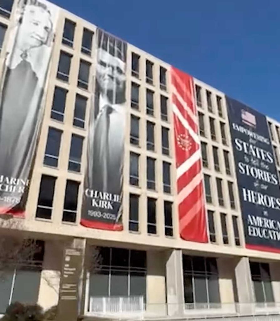 Snopes.com confirms that six banners honoring Americans now hang from the block-spanning Lyndon B Johnson Education Building in Washington, the offices of the US Education Department.